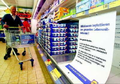 Ein Kunde von Lidl nimmt ein leeres Milchregal nebst Information zur Kenntnis.
