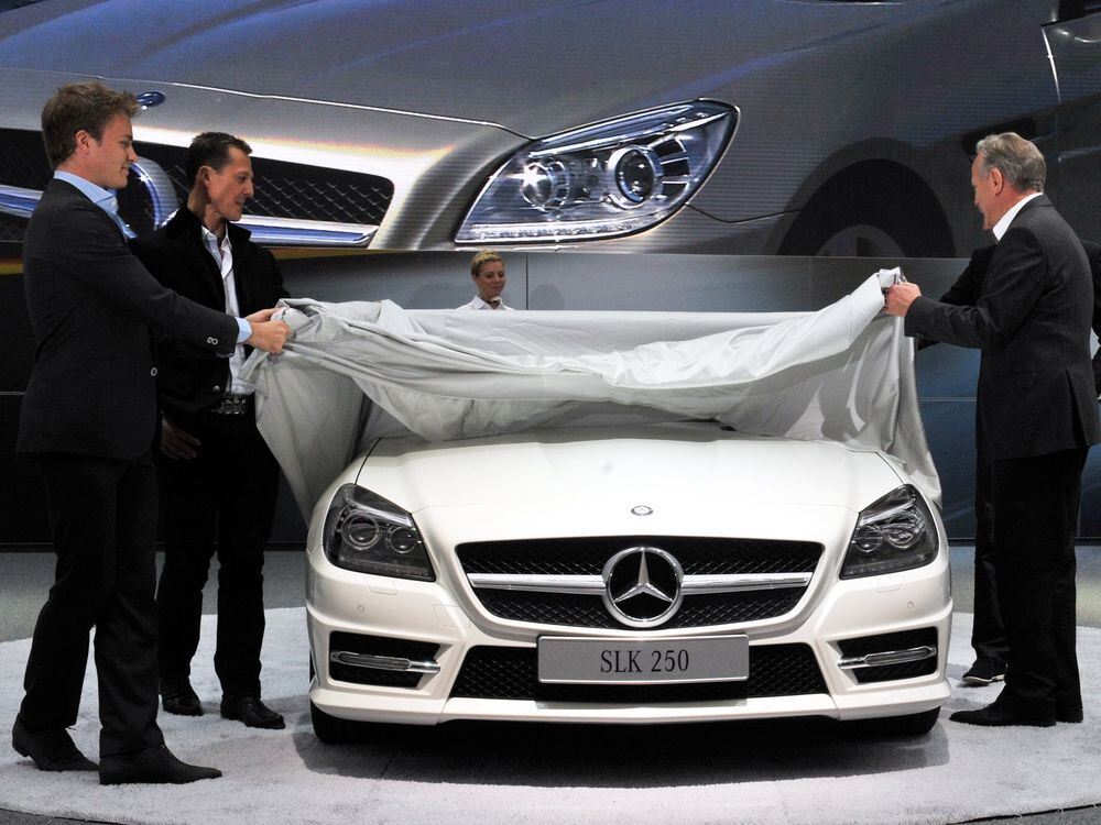 Die beiden Formel 1 Piloten Nico Rosberg und Michael Schumacher enthüllen im Mercedes Werk in Sindelfingen gemeinsam mit Joachim Schmidt, Leiter für Vertrieb und Marketing bei Mercedes, den neuen Mercedes SLK Sportwagen. Bei der Weltpremiere in Sindelfingen wird die dritte Generation des Cabriolet Sportwagens präsentiert.