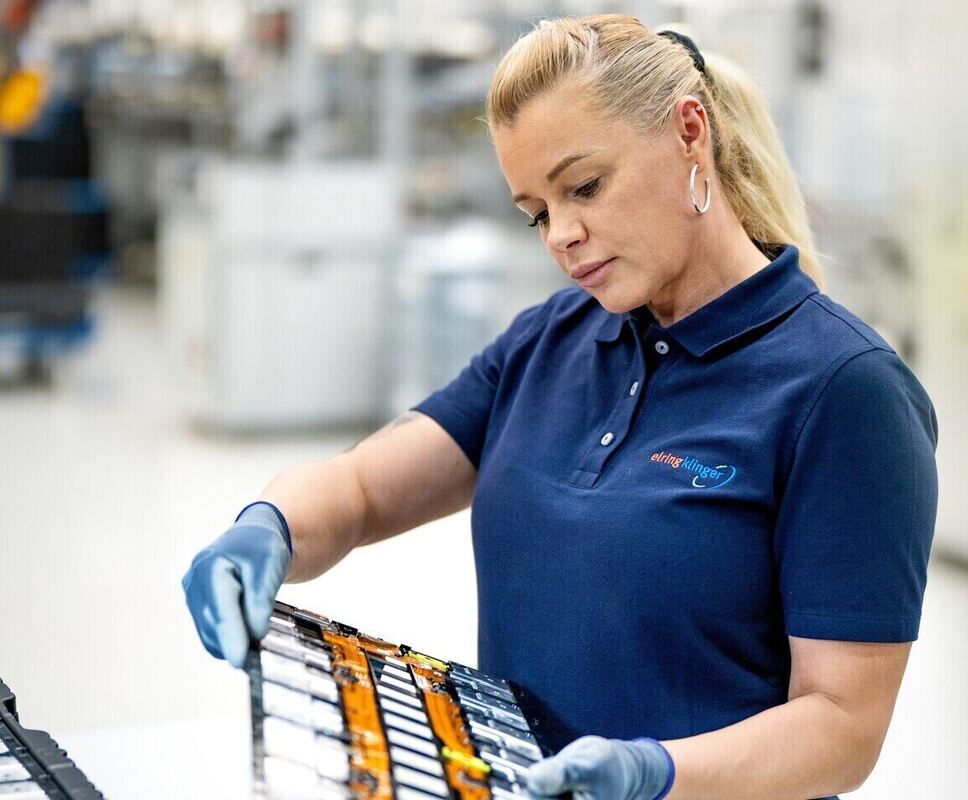 Eine Mitarbeiterin des Geschäftsbereichs Elektromobilität von Elring Klinger prüft am Standort Neuffen ein Zellkontaktiersystem.