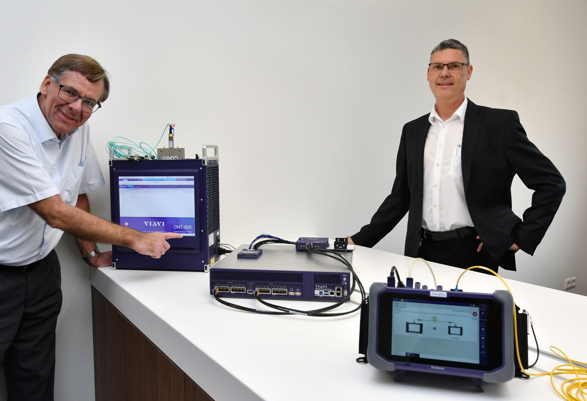 Geschäftsführer Andreas-Christoph Beyertt (rechts) und Entwicklungsleiter Dietmar Tandler von Viavi Solutions (früher: Wandel & Goltermann) in Eningen führen Test- und Analysegeräte für Daten- und Kommunikationsnetze vor. FOTO: MEYER