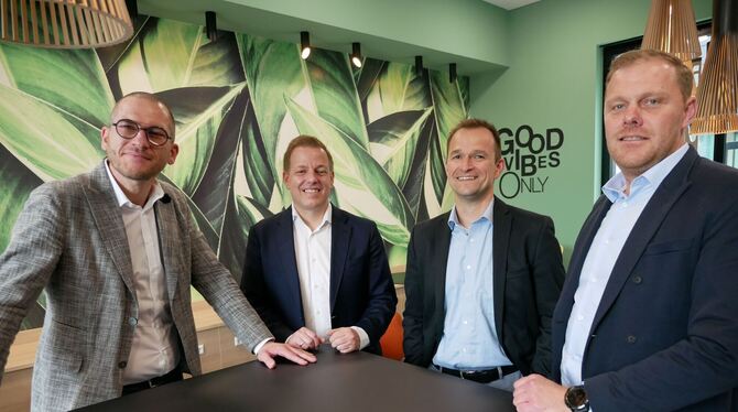 Freuen sich über eine überaus positive Entwicklung bei Lechler in Metzingen, die drei Prokuristen (von rechts) Peter Hess, Heiko Wehrnhöner und Matthias Schneider (links) sowie der alleinige Geschäftsführer Patrick Muff (Zweiter von links). FOTO: LEISTER