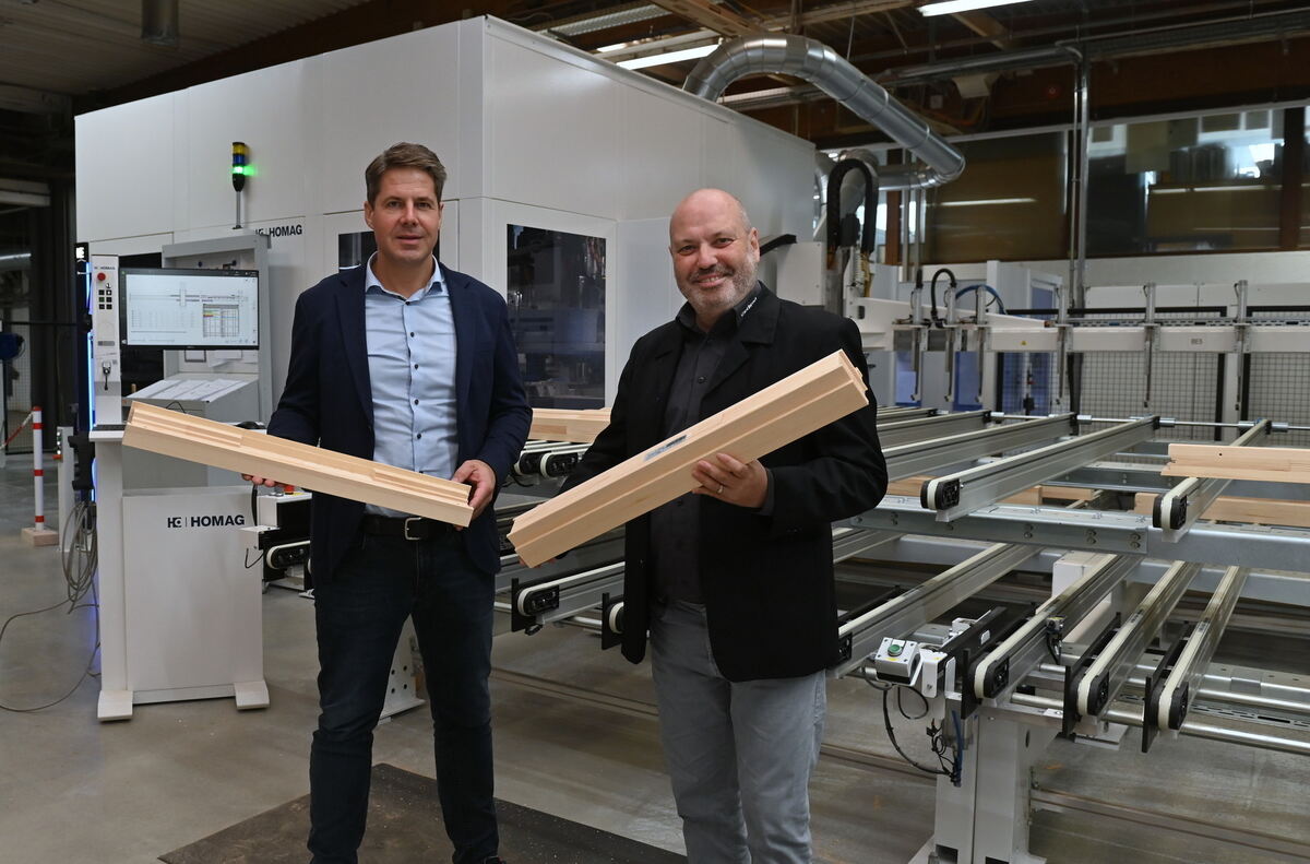 Stefan Reitze (links) und Uwe Kopf, geschäftsführende Mitgesellschafter der Gutbrod Fenster und Türen GmbH & Co. KG , vor der neuen Holzbearbeitungsmaschine.