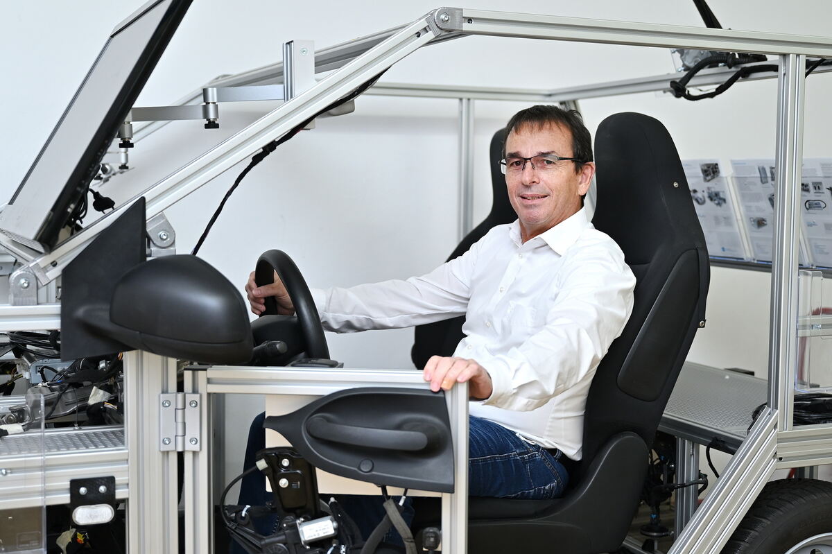 Armin Baumann in einem Fahrzeugmodell, das alle elektronischen Verbraucher und Steuergeräte für Tests abbildet.
