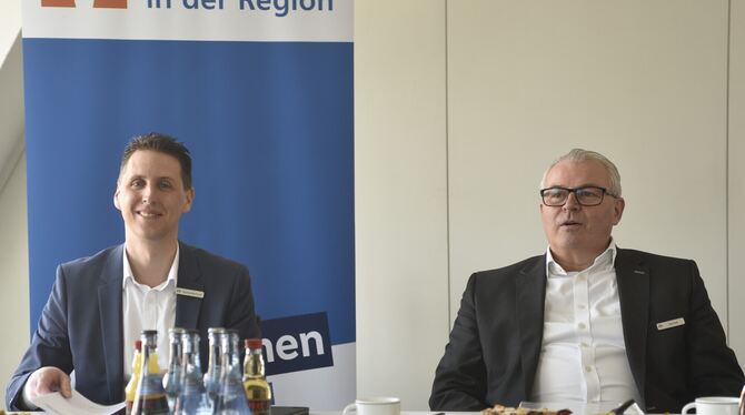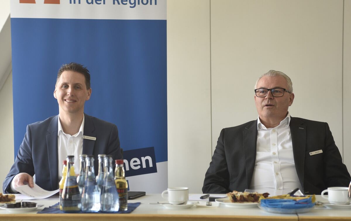 Die beiden Co-Vorstandssprecher Thomas Bierfreund (links) und Jörg Stahl präsentierten die Geschäftszahlen des Jahres 2024 der Volksbank in der Region. FOTO: REICHERT