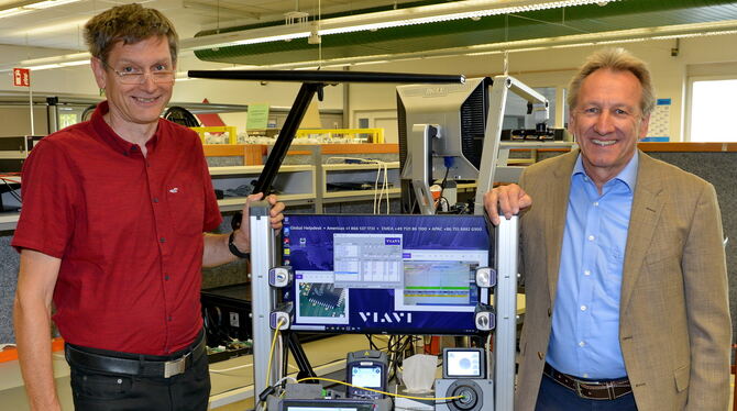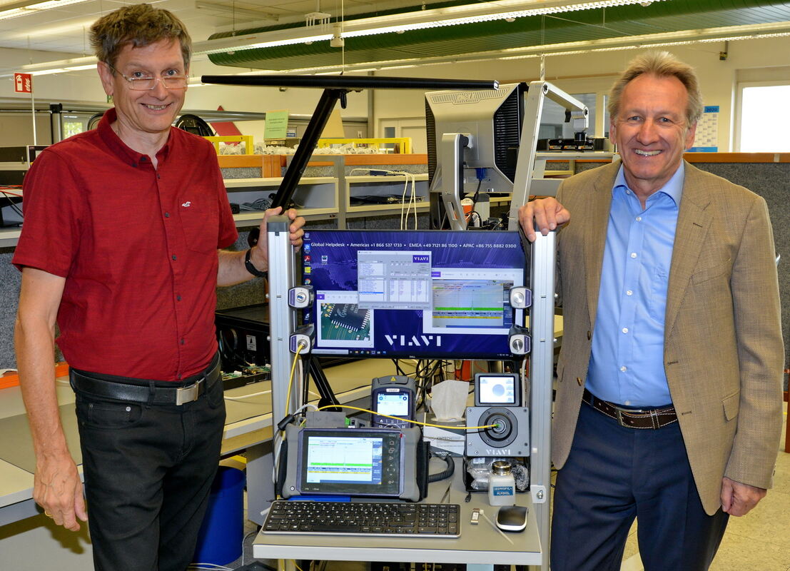 Geschäftsführer Rolf Trieflinger (rechts) und der zuständige Fertigungsleiter Alfred Stenzel von Viavi Solutions Deutschland in Eningen führen ein Messgerät für Glasfaserübertragungssysteme vor. FOTO: NIETHAMMER