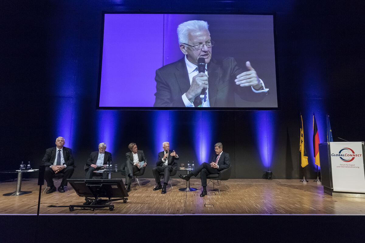 Auf dem Podium diskutierten (von links): Frank Sportolari (Präsident AmCham Germany), Ex-Außenminister Joschka Fischer, Moderator Hajo Schumacher, Ministerpräsident Winfried Kretschman und VDA-Präsident Bernhard Mattes.