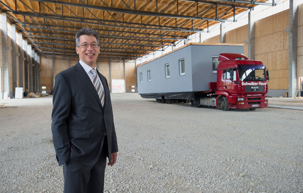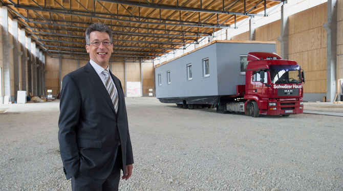 Johannes Schwörer in der in Oberstetten entstehenden Produktionshalle für den Bau von Mini-Häusern (»Flying Spaces«), wie eines auf dem Lastwagen zu sehen ist, das als Meisterbüro mit der Halle verbunden werden soll. FOTO: TRINKHAUS