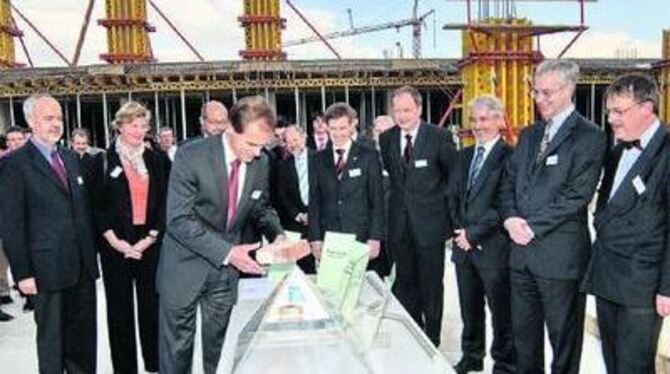 Landrat Thomas Reumann( von links), Reutlingens Erste Bürgermeisterin Ulrike Hotz, Volkmar Denner, Mitglied der Bosch-Geschäftsführung (vorne), Christoph Kübel, Vorsitzender des Bereichsvorstands Automobilelektronik, Bernd Häuser, technischer Werksleiter, Klaus Schmidt, Entwicklungsleiter, Helmut Böttcher, kaufmännischer Werksleiter, und Betzingens Bürgermeister Thomas Keck.