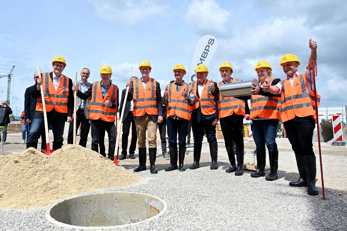 Grundsteinlegung für den künftigen Firmensitz von Magura Bosch Parts & Services (MBPS) in Nürtingen (mit Leuchtwesten, von links): MBPS-Geschäftsführer Jochen Hoppe, Claus Fleischer (Chef von Bosch E-Bike Systems), Nürtingens Oberbürgermeister Johannes Fridrich, Fabian Auch (geschäftsführender Gesellschafter Magenwirth Technologies Group), Hubert Schöllhorn (Großprojektleiter Max Bögl), Architekt Thomas Sonnentag, MBPS-Geschäftsführerin Martina Class mit Zeitkapsel und Falk Scheuber (Robert Bosch GmbH). FOTO: PIETH