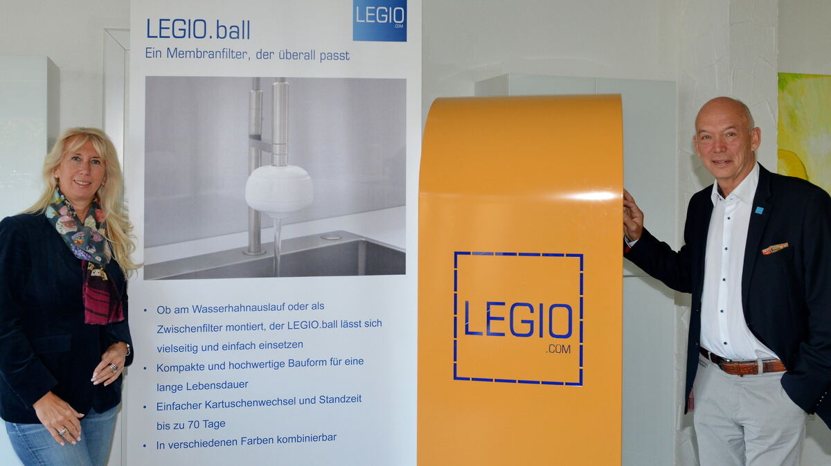 Christine Anderko und Rainer Kaifel leiten die Legio-Group in Walddorfhäslach. Kaifel steht neben dem neuen Gerät für die Trinkwasserkontrolle, für das die baden-württembergische Umweltministerin Thekla Walker das Unternehmen ausgezeichnet hat. FOTO: NIETHAMMER