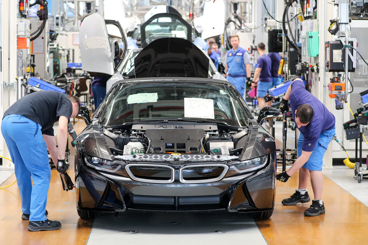 Mitarbeiter im BMW-Werk Leipzig arbeiten in der Montage des i8. Der Plug-in-Hybrid-Sportwagen wird seit 2013 dort gebaut. FOTO: DPA