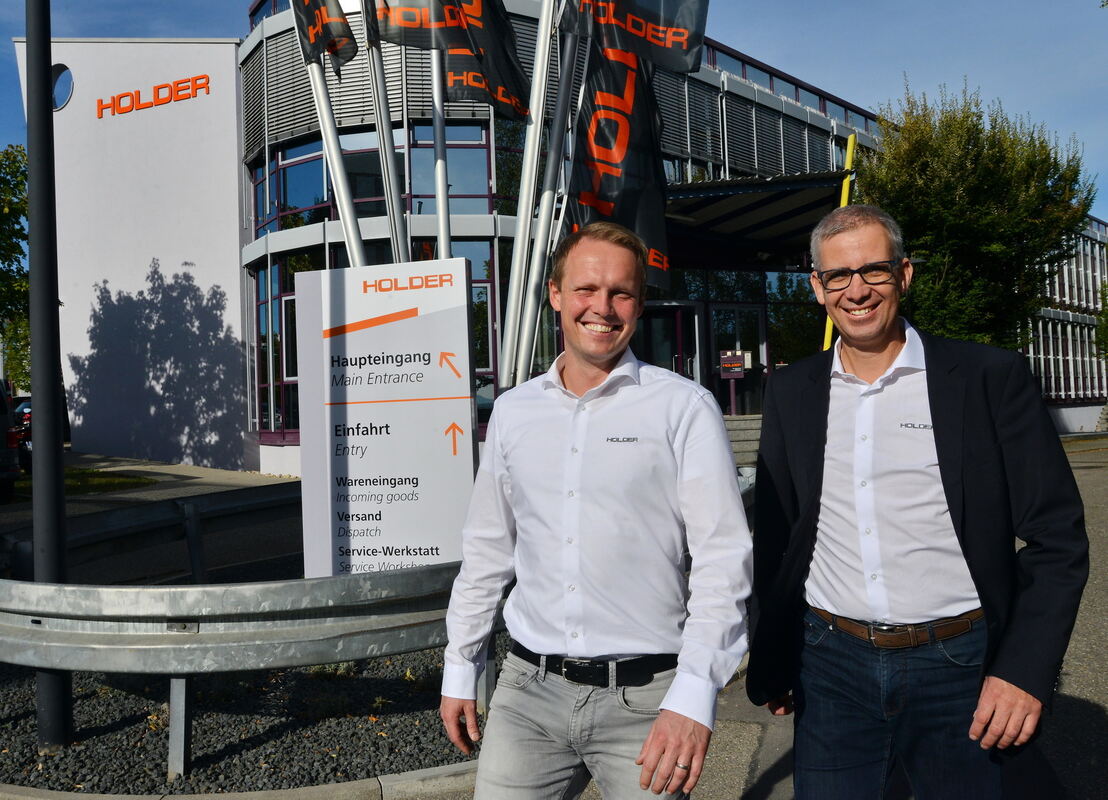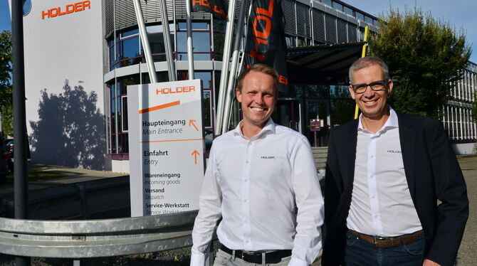 Die Geschäftsführung der Max Holder GmbH, Christian Mayer (links) und Vorsitzender Andreas Vorig, vor dem neuen Firmensitz im gemeinsamen Gewerbegebiet von Reutlingen und Kirchentellinsfurt. FOTO: NIETHAMMER