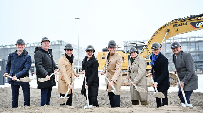Spatenstich für ein neues Verwaltungsgebäude von Hugo Boss in Metzingen (von links): Matthias Both (Geschäftsführer des Stuttgarter Architekturbüros Blocher Partners), Rainer Schmetzer (Leiter Bauabteilung Hugo Boss), Sinan Piskin (Betriebsratsvorsitzender Hugo Boss), Oberbürgermeisterin Carmen Haberstroh, Daniel Grieder (Vorstandsvorsitzender Hugo Boss), Uwe Holy (ehemaliger Vorstandsvorsitzender Hugo Boss und Enkel des Firmengründers), Marc Holy (Aufsichtsratsvorsitzender Outletcity AG und Urenkel von Hugo Boss) und Yves Müller (Vorstandsmitglied Hugo Boss).