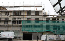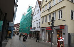 Baustelle »Katharinenhof« in Reutlingen an der Hofstattstraße, an der Katharinenstraße ist das Gerüst bereits entfernt.