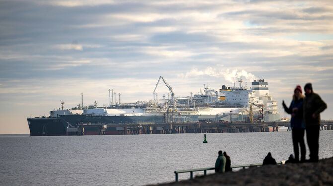Das Tankschiff »Maria Energy« liegt am schwimmenden LNG-Terminal in Wilhalmshaven an. FOTO: SCHULDT/DPA