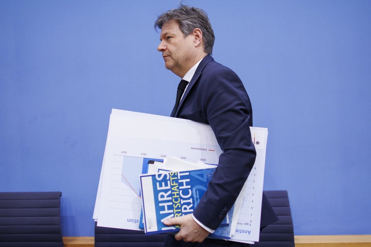Robert Habeck (Bündnis 90/Die Grünen), Bundesminister für Wirtschaft und Klimaschutz, trägt den Jahreswirtschaftsbericht unter dem Arm nach der Pressekonferenz zur Vorstellung des Jahreswirtschaftsberichts 2024 im Haus der Bundespressekonferenz.