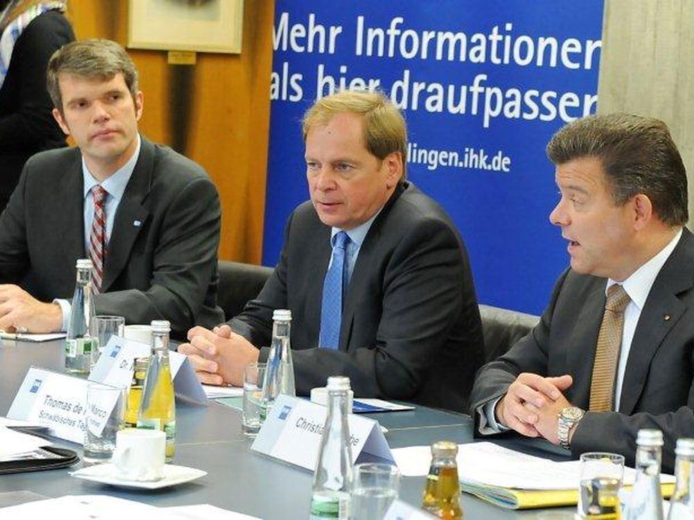 Pressekonferenz der IHK Reutlingen (von rechts): IHK-Chefvolkswirt Markus Nawroth, IHK-Präsident Christian Erbe, Hauptgeschäftsführer Wolfgang Epp und Pressesprecher Christoph Heise. FOTO: PACHER