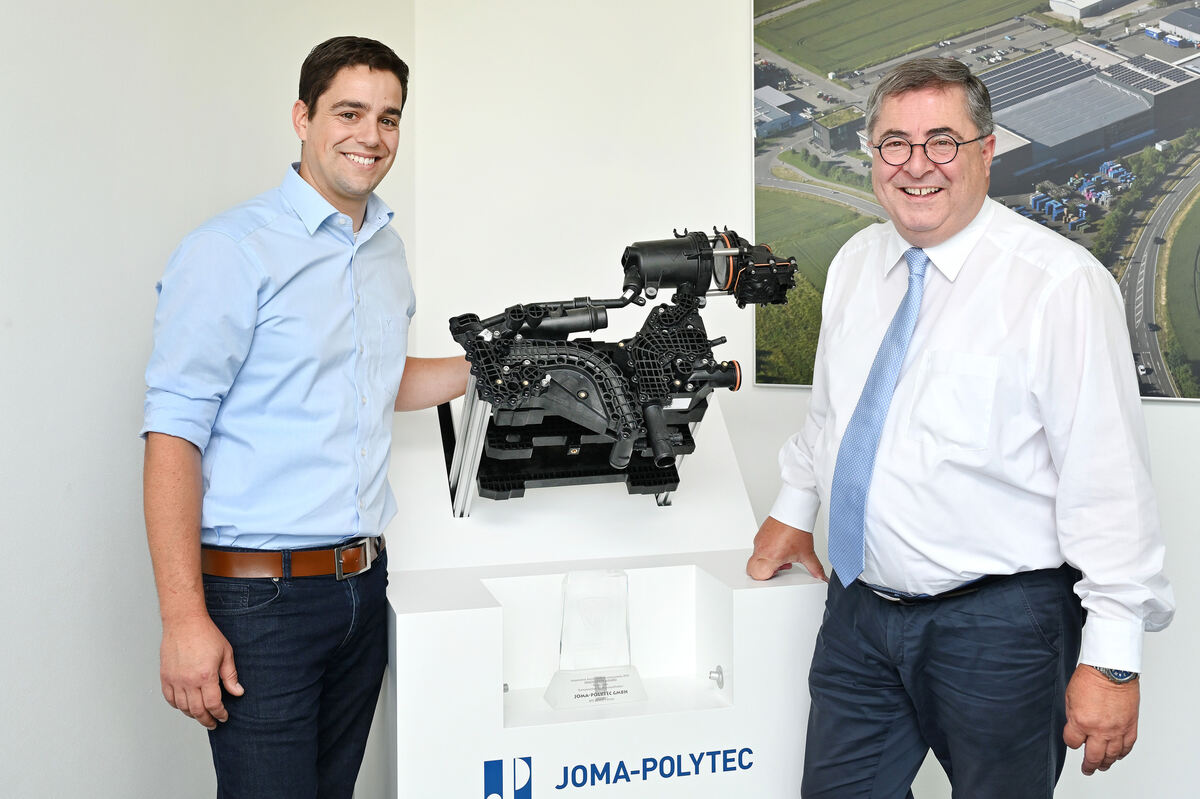 Hans-Ernst Maute (rechts), geschäftsführender Gesellschafter, und sein Sohn Johannes Maute, Prokurist und Gesellschafter, zeigen ein von Joma-Polytec hergestelltes Strukturbauteil für eine Brennstoffzelle. FOTO: PIETH