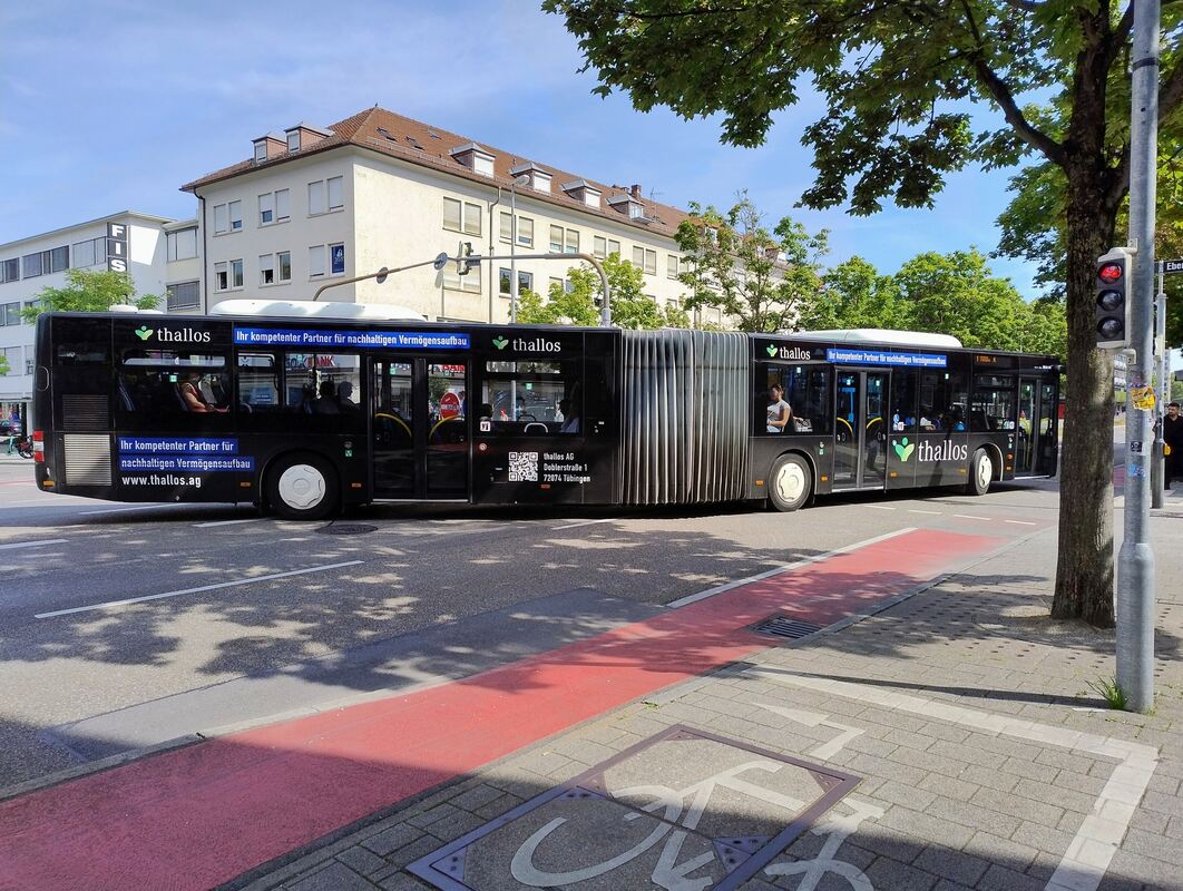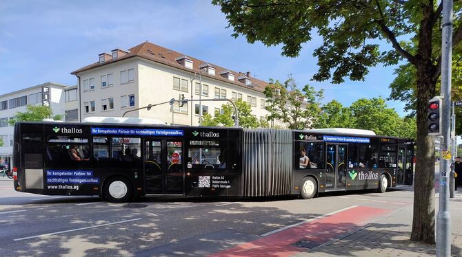 Linienbus in Reutlingen mit Werbung der Tübinger Thallos AG, die sich in einem Insolvenzverfahren in Eigenverwaltung befindet.