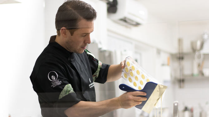 Wer mag, kann dem Chocolatier Kevin Kugel bei der Arbeit zusehen und gleich seine Kreationen genießen. FOTOS: KUGEL