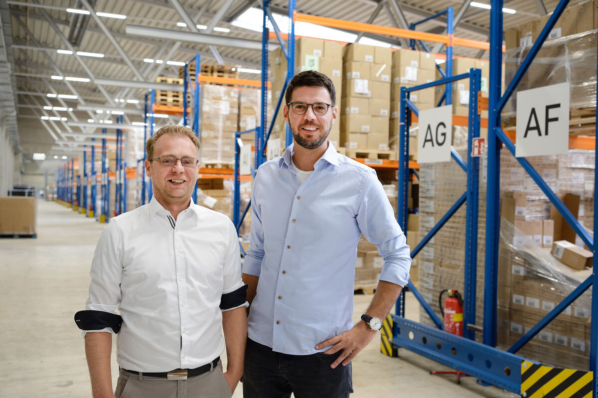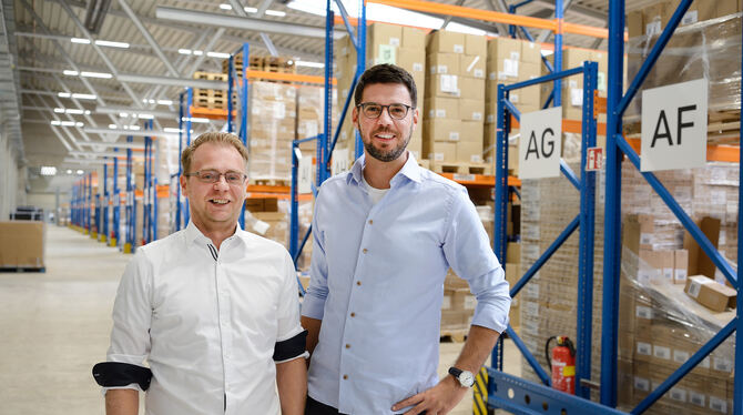 David Primm (rechts) ist Geschäftsführer der Impex Service GmbH und der Fotoprofi GmbH, Daniel Becht Geschäftsführer der Digital-Versand.de Online GmbH. Die Firmen verfügen in der früheren Seidenweberei-Halle über eine riesige Logistikfläche.