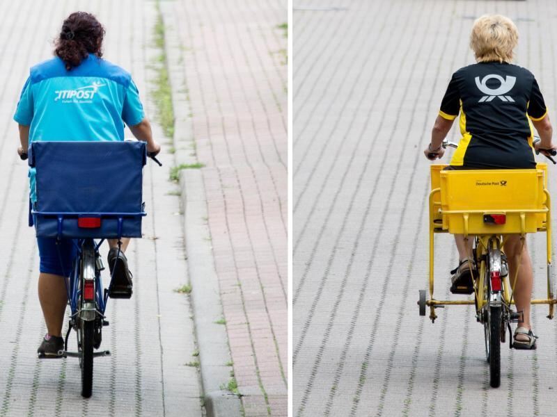 Die Bildkombo zeigt jeweils in der gleichen Straße die Mitarbeiterin eines privaten Postzustellers und der Deutschen Post beim Austragen der Post. Foto: Julian Stratenschulte/Symbolbild