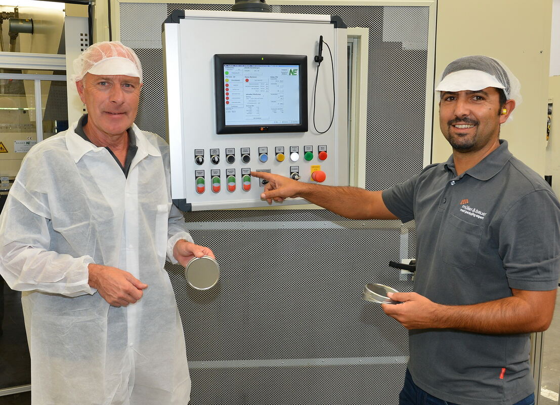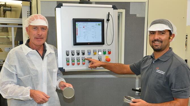 Geschäftsführer Richard Hönes (links) und Pedro Martins, Meister in der Stanzerei, führen einen neuen Tafelstanzautomaten des Dosenherstellers Müller & Bauer in Metzingen vor.Foto: Niethammer