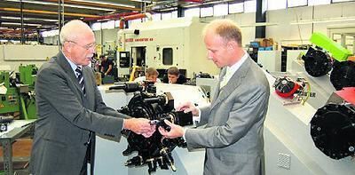 Reiner Sauter (links) und Heiko Müller, Sohn und Enkel des Firmengründers, an einem Werkzeugrevolver.