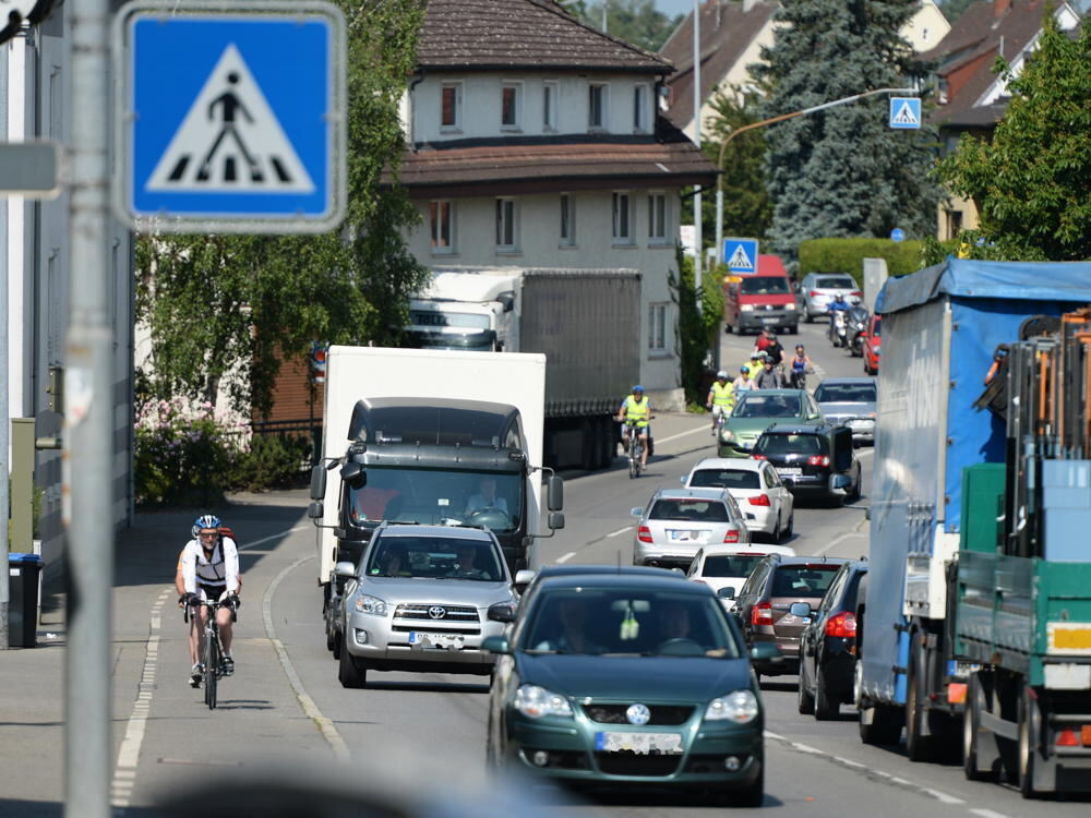 Zahlreiche Laster, Autos und Radler fahren auf der Bundesstraße 31 durch den Friedrichshafener Teilort Fischbach am Bodensee. Wirtschaft und Lokalpolitik fordern schon lange eine Umgehungsstraße um Friedrichshafen