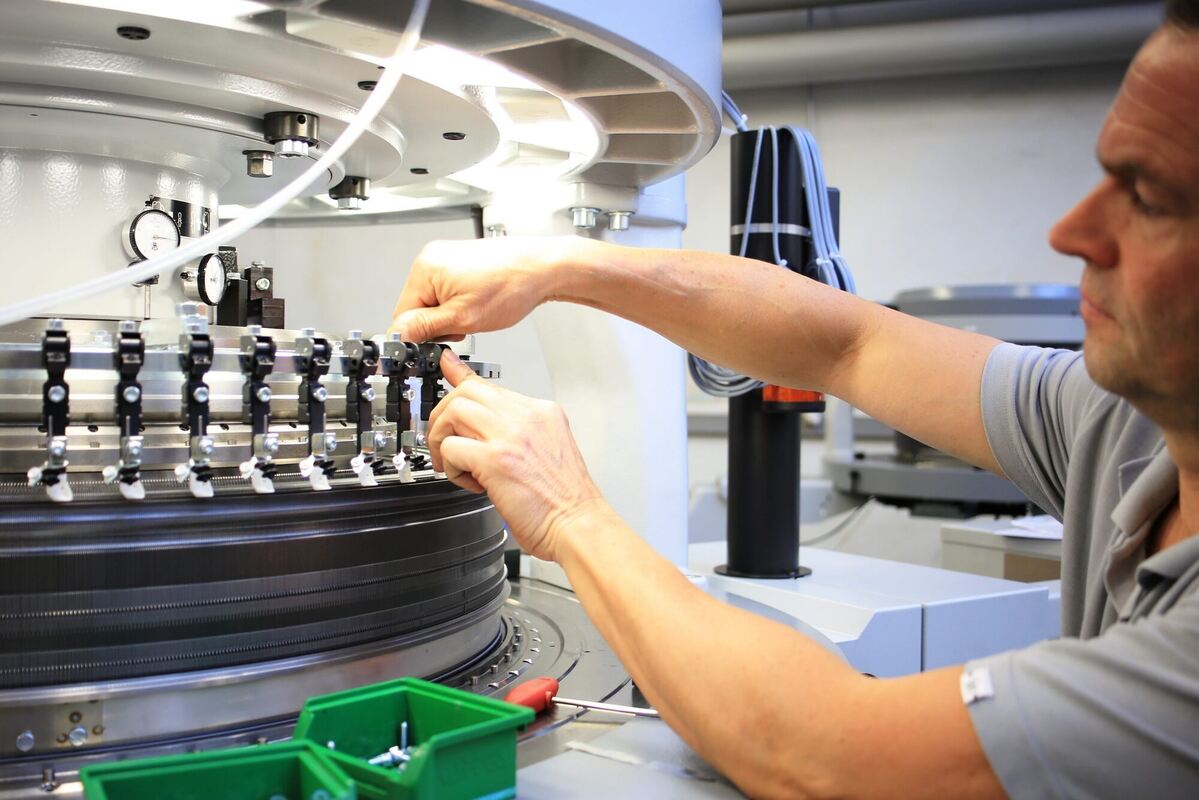 Ein Mitarbeiter von Mayer & Cie. arbeitet an einer Rundstrickmaschine.
