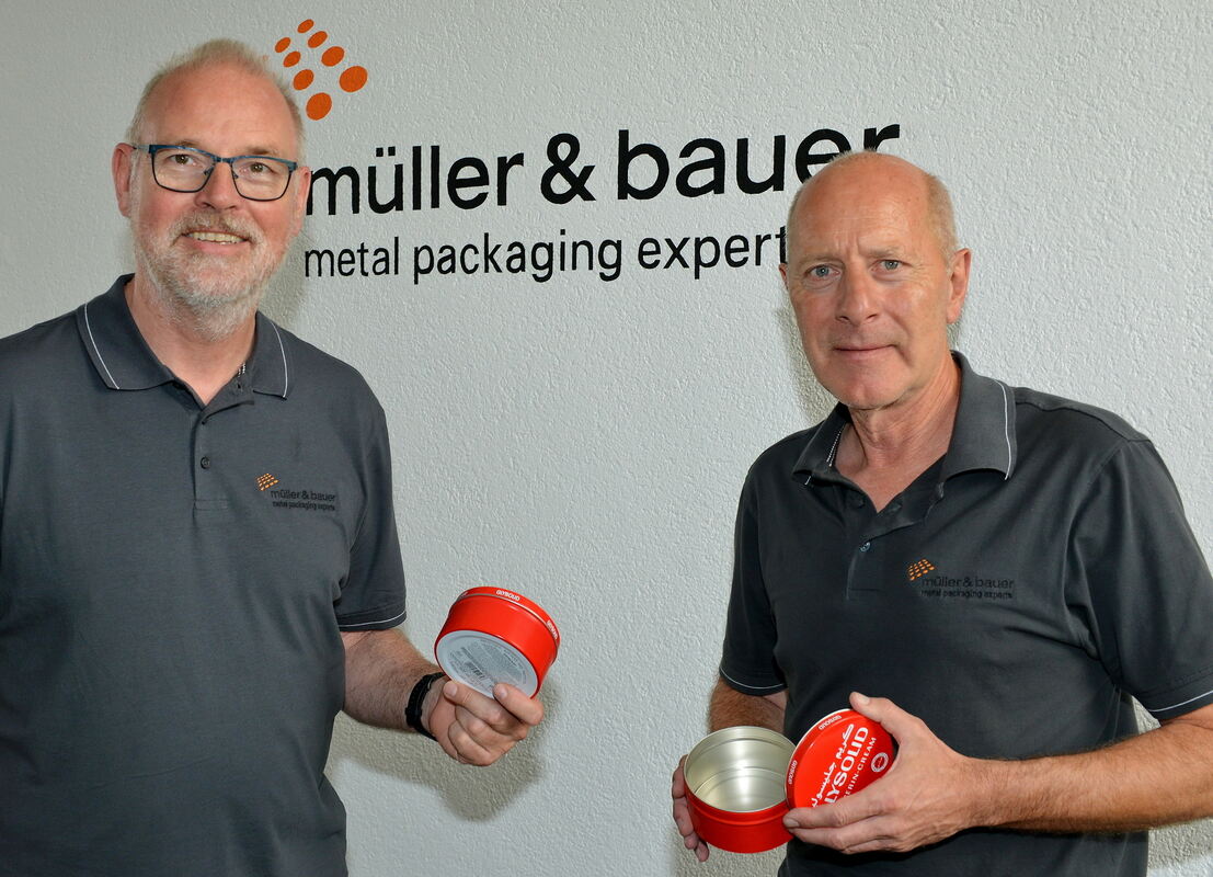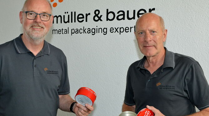 Der langjährige Geschäftsführer Richard Hönes (rechts) und sein neuer Geschäftsführer-Kollege Thomas Ostkamp präsentieren eine neu entwickelte 500-Milliliter-Stülpdeckeldose des Metzinger Traditionsbetriebs Müller & Bauer.