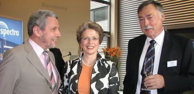 Die Reutlinger Oberbürgermeisterin Barbara Bosch und der Kirchentellinsfurter Bürgermeister Bernhard Knauss (links) gratulierten Harald Lang zum Firmenneubau.
