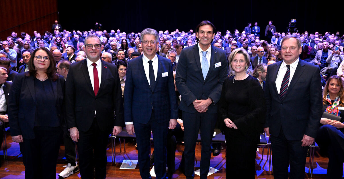 Beim Neujahrsempfang in der Reutlinger Stadthalle (von links): Christiane Nowottny, Hauptgeschäftsführerin der Handwerkskammer, Alexander Wälde, Präsident der Handwerkskammer, IHK-Präsident Johannes Schwörer, LKA-Präsident Andreas Stenger, Landeswirtschaftsministerin Nicole Hoffmeister-Kraut und IHK-Hauptgeschäftsführer Wolfgang Epp.