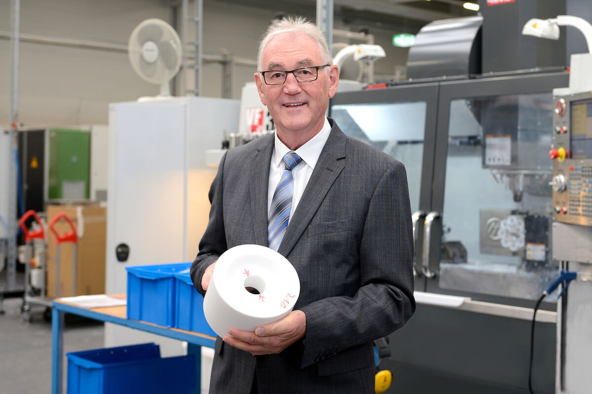 Berghof-Geschäftsführer Nikolaus Rombach mit einer Rolle des Materials PTFE (auch als Teflon bekannt), das heute aus technischen Anwendungen nicht mehr wegzudenken ist, wegen seiner Chemikalien- und Temperaturbeständigkeit. FOTO: PIETH
