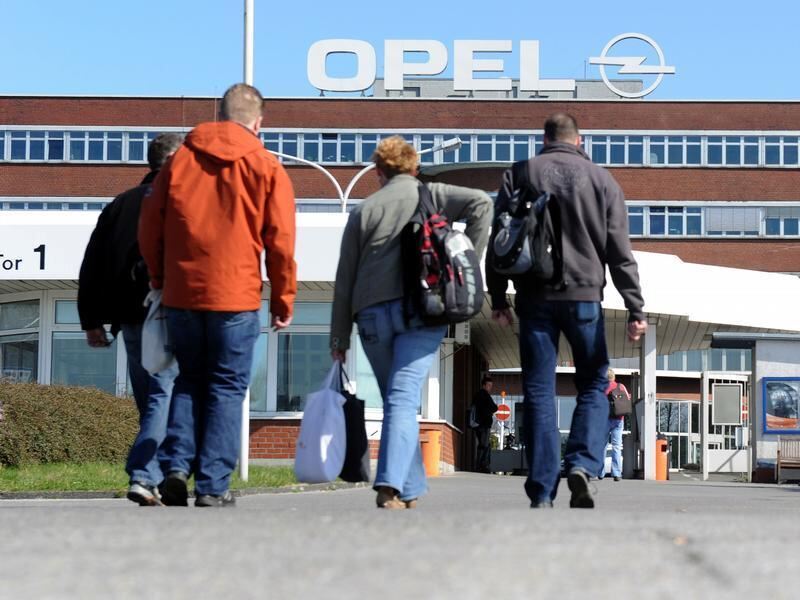 Mitarbeiter gehen zum Schichtwechsel durch den Personaleingang zum Opel Werk in Bochum. Foto: Caroline Seidel/Archiv