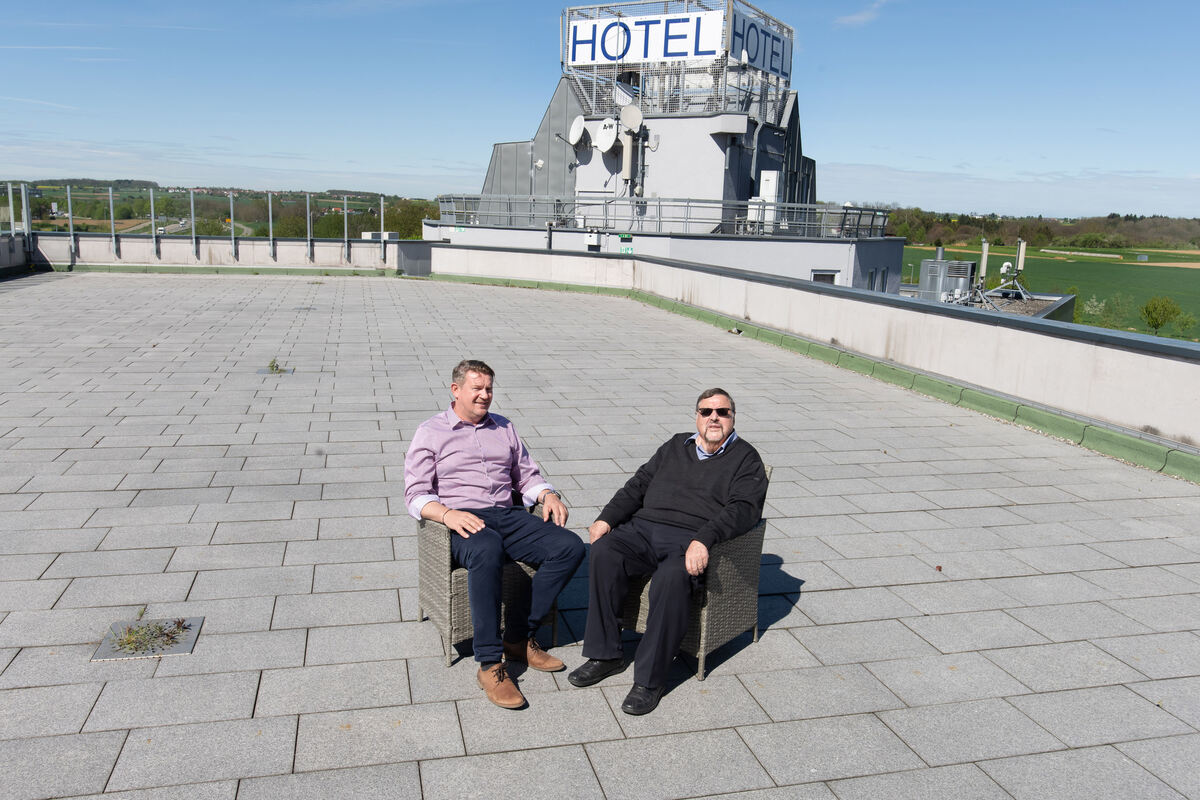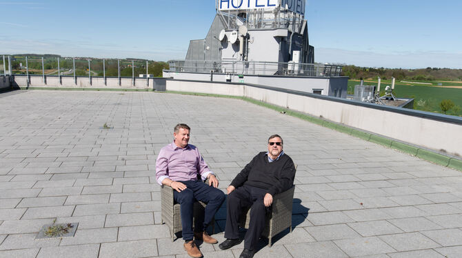 Geschäftsführer Hans-Joachim Neveling (rechts) und Marketing- und Veranstaltungsleiter Paul Jurik wollen die Dachterrasse des Fortuna-Hotels Reutlingen/Tübingen zu einem Panorama-Saal umbauen lassen. Zudem haben sie Pläne für ein Veranstaltungs- und Ausstellungszentrum im Landkreis Tübingen, das gleich neben dem Hotel – auf dem Foto oben – beginnt. FOTO: TRINKHAUS