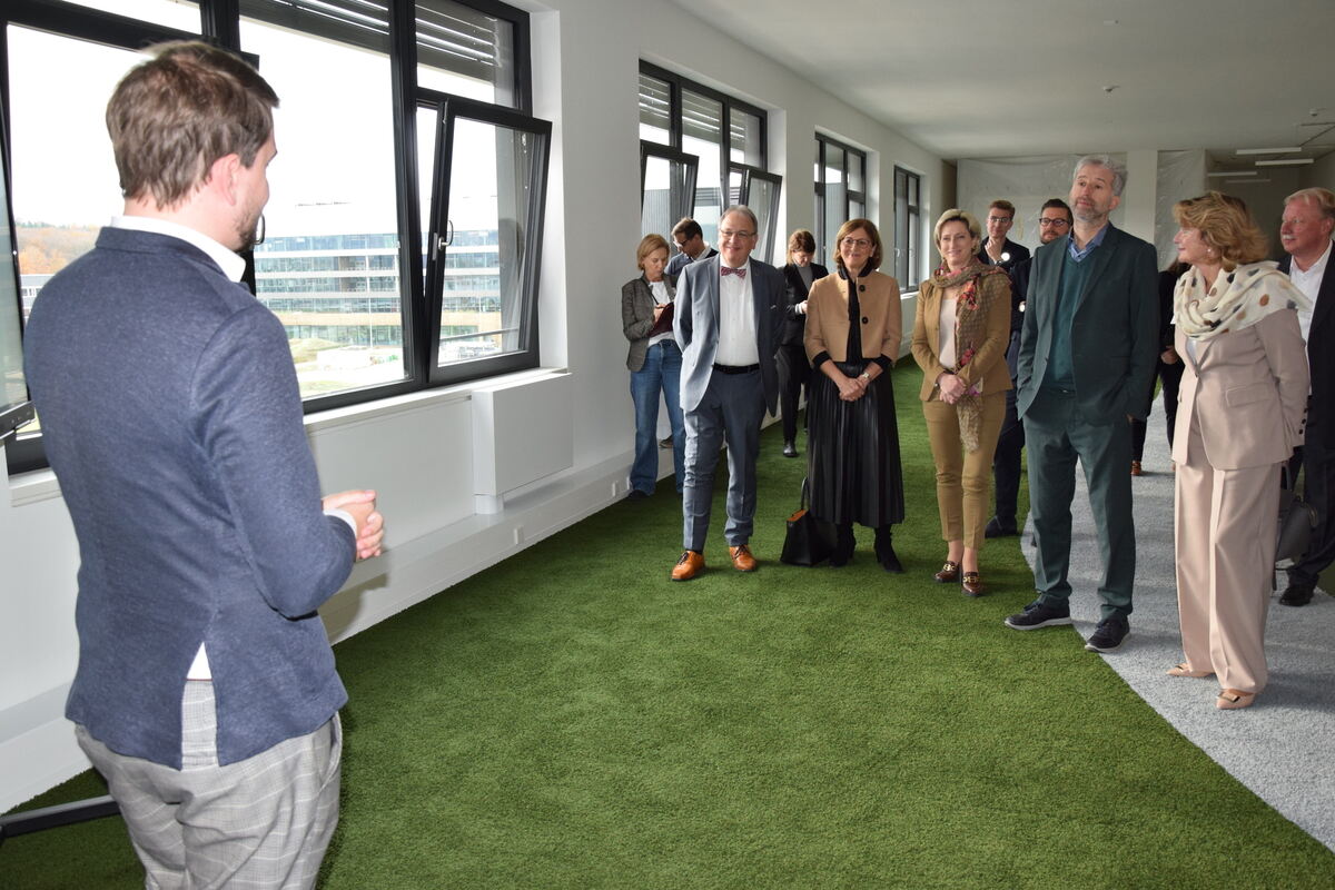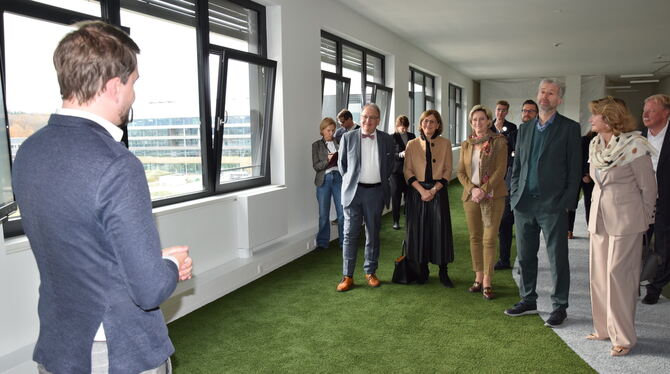 Reutlingens OB Thomas Keck, die L-Bank-Vorstandsvorsitzende Edith Weymayr, Wirtschaftsministerin Nicole Hoffmeister-Kraut, Tübingens OB Boris Palmer und L-Bank-Verwaltungsratsmitglied Claudia Diem (von links) lassen sich von Daniel Korn die Vorteile des neuen Gebäudes erklären. Korn ist Geschäftsführer von Rescuetrack, einer der ersten Mieter im neuen TTR-Gebäude. FOTO: ZABOTA