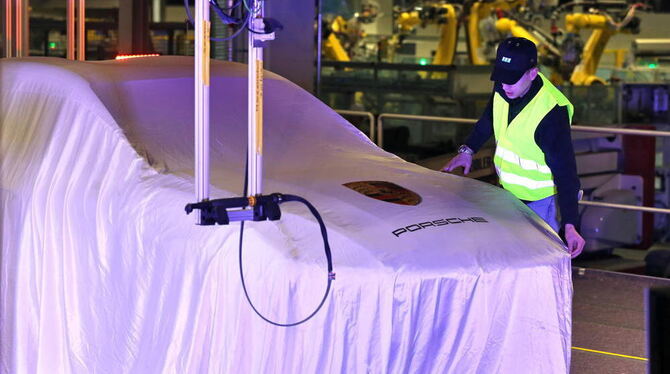 Ein Mann richtet das Tuch über einem verhüllten Porsche Macan in der neuen Karosseriefertigung des Sportwagenbauers in Leipzig.