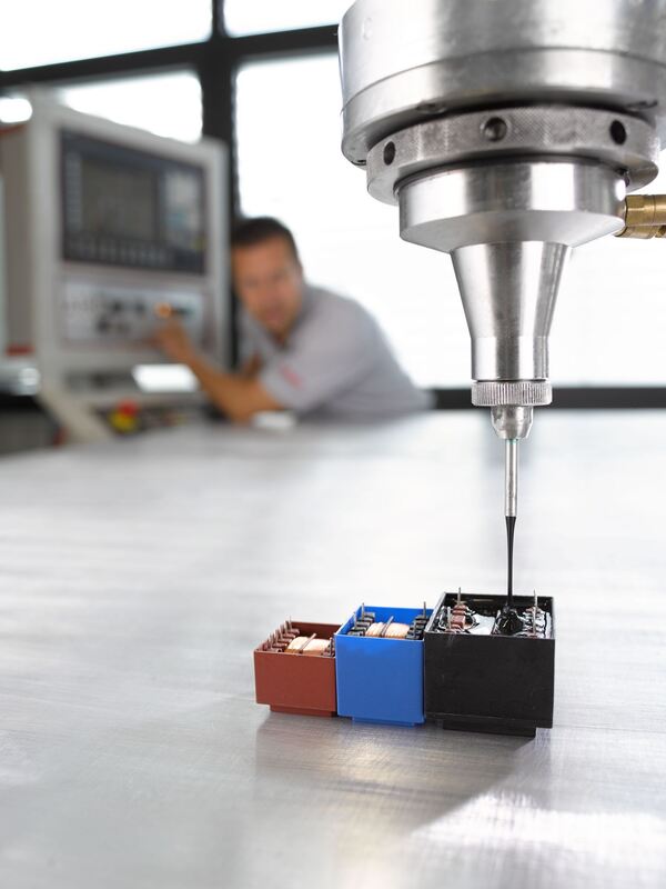 Ein Mitarbeiter dosiert Elektrovergussmasse in einen Transformator, um diesen vor chemischen Substanzen und Umwelteinflüssen zu schützen. FOTO: RAMPF