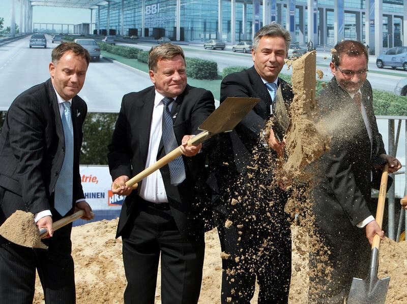 Hartmut Mehdorn (2. v. l.) will nach Informationen der »Bild« beim BER wieder mit anpacken. Foto: Patrick Pleul/Archiv