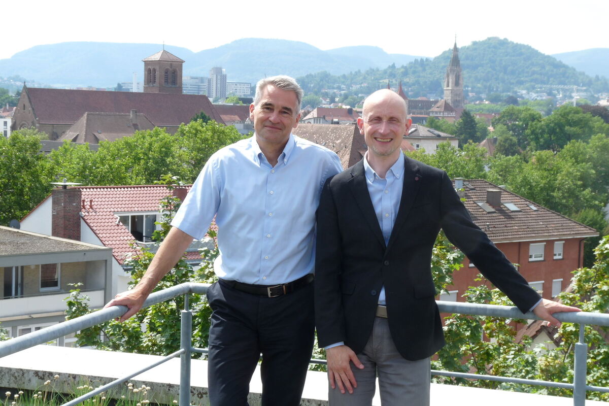 Johannes Neuer, Bibliothekarischer Direktor der Ekz (rechts), und Geschäftsführer Jörg Meyer auf der Dachterrasse des Stammsitzes. FOTO: HÄRING