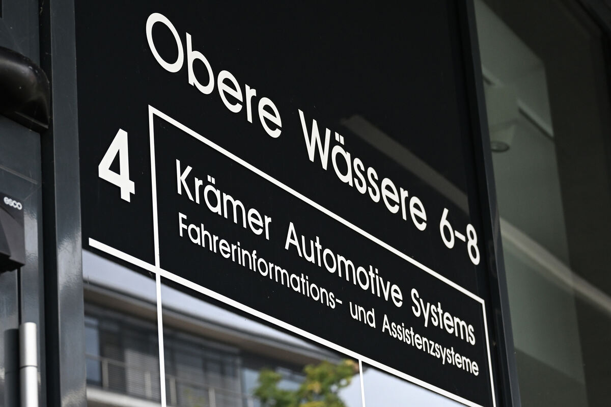Hinweis auf das Unternehmen Krämer Automotive Systems an einem Gewerbegebäude in Reutlingen.