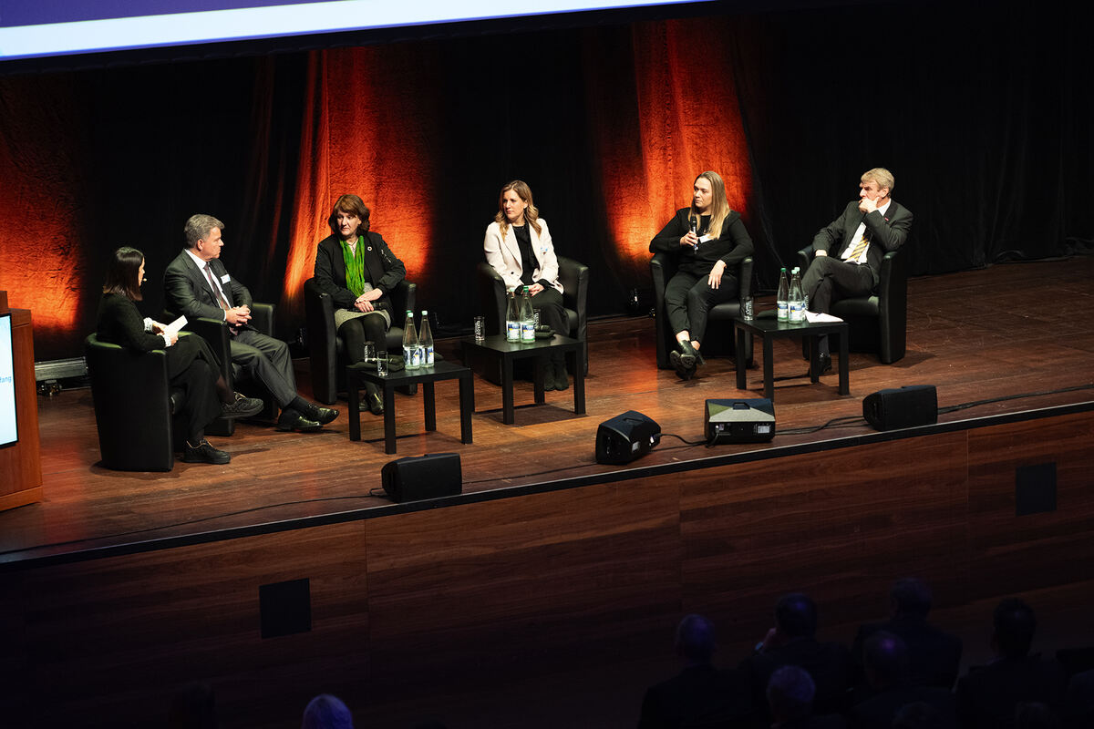 Podium beim Neujahrsempfang (von links): Moderatorin Julia Bauer, IHK-Präsident Christian Erbe, Staatssekretärin Gisela Splett, Corinna Lettmann, Vorsitzende der Wirtschaftsjunioren, Désirée Grießhaber-Vetter, Geschäftsführerin Bio-Mtzger Grießhaber und Harald Herrmann, Präsident der Handwerkskammer Reutlingen.