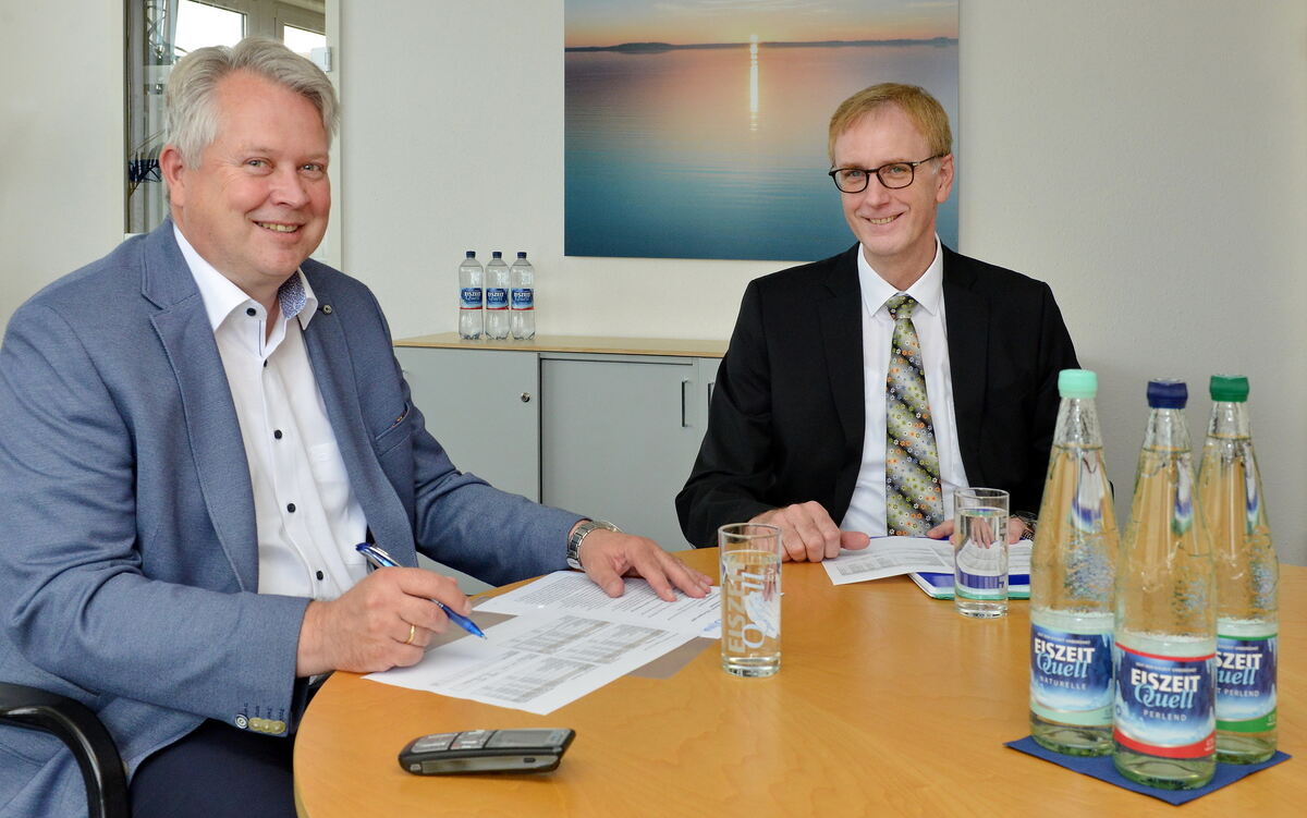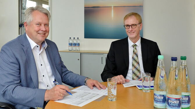 Stefan Gugel (links) und Achim Jarck sind die Geschäftsführer der Romina Mineralbrunnen GmbH. FOTO: NIETHAMMER