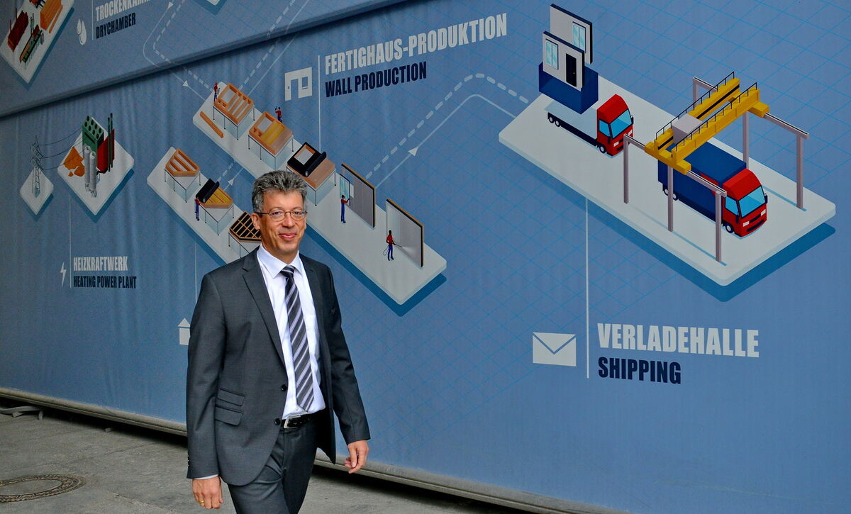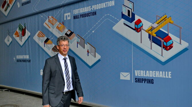 Geschäftsführer Johannes Schwörer vor einer neuen Übersichtstafel für Werksführungen in Oberstetten.Foto: Niethammer
