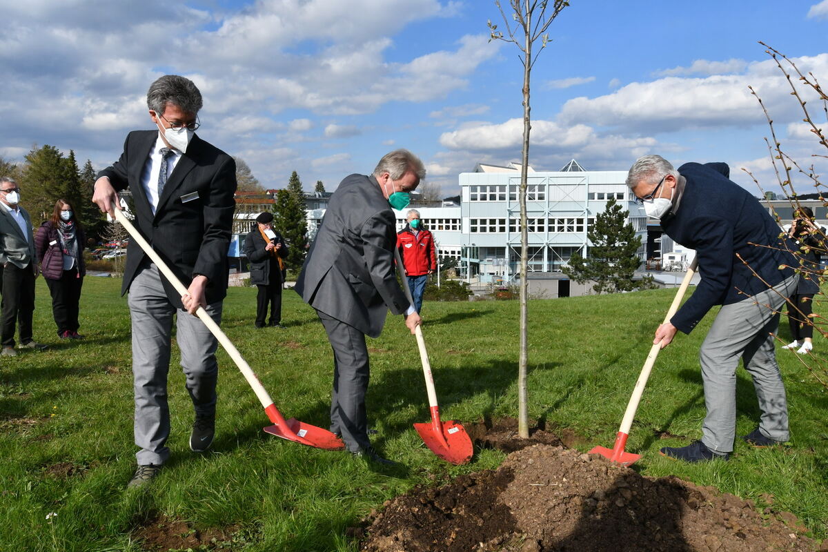 Sie soll Symbol der ökologischen Ausrichtung des Unternehmens sein: Firmenchef Johannes Schwörer (links), Umweltminister Franz Untersteller (Mitte) und Hohensteins Bürgermeister Jochen Zeller pflanzen eine Elsbeere auf dem Betriebsgelände.
