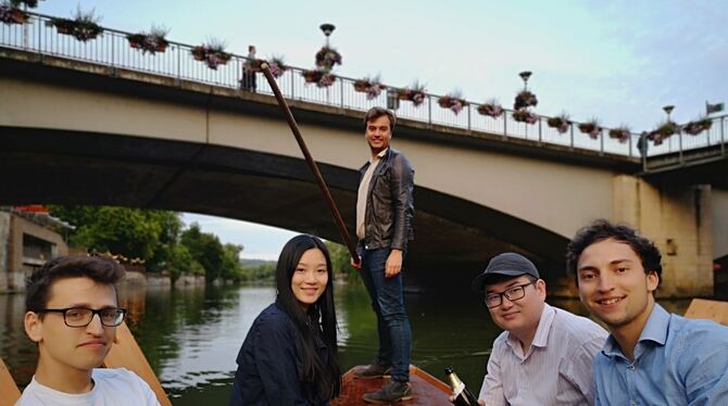 Start-up Skillroad mit den Gründern Tom Frense (links), Fabian Hiller (stehend) und Robert Reinartz mit chinesischen Geschäftspartnern im Stocherkahn. FOTO: PRIVAT