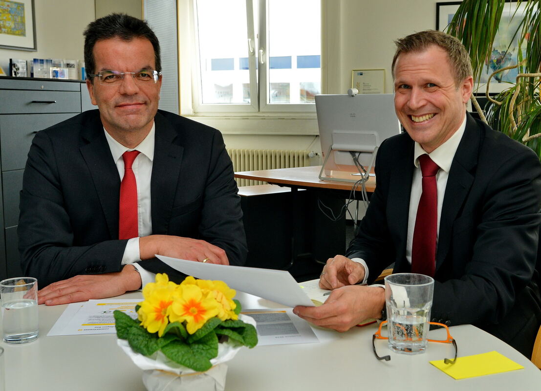 Ralph Solveen (links) und Patrick Greuter, Niederlassungsleiter Firmenkunden der Commerzbank in Reutlingen. ARCHIVFOTO: NIETHAMMER