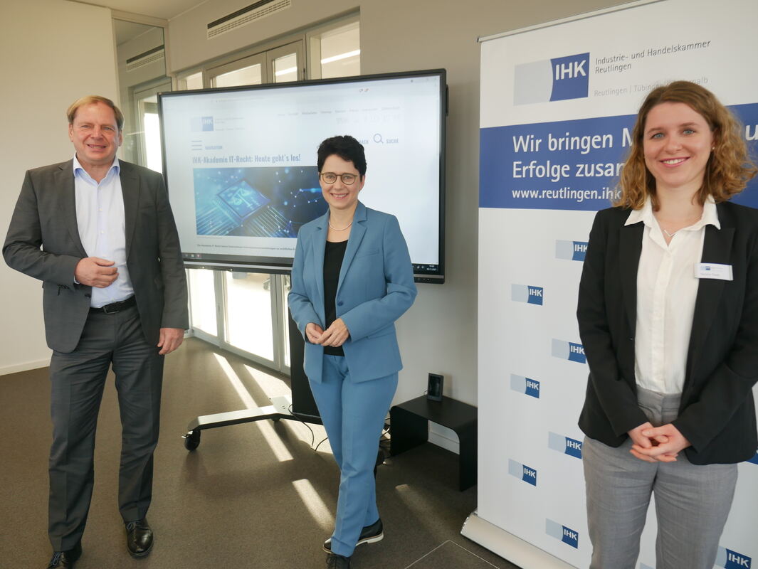 Bei einem Besuch von Landesjustizministerin Marion Gentges (Mitte) wurde im Beisein von Wolfgang Epp, Hauptgeschäftsführer der Industrie- und Handelskammer Reutlingen, und von Natalie Trück als künftiger Organisatorin die Akademie IT-Recht eröffnet.