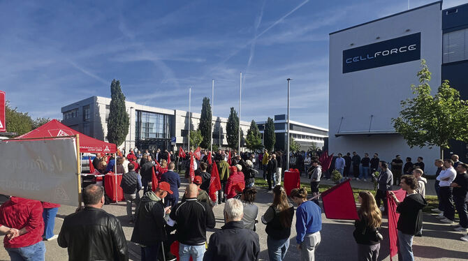 Rund 250 Menschen waren am Montagmorgen bei der Veranstaltung der IG Metall, um beim Batteriehersteller Cellforce in Kirchentellinsfurt die Arbeitspläte zu erhalten. Fotos: David Drenovak
